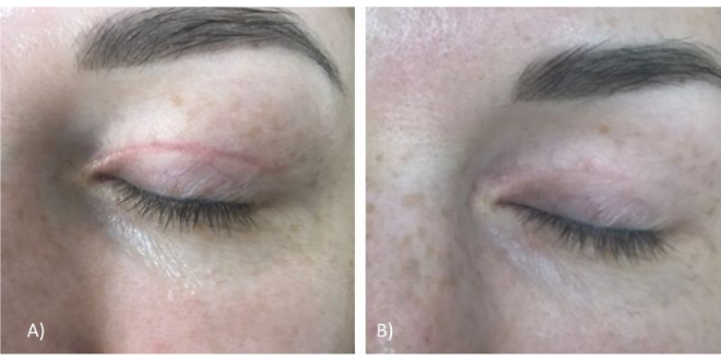 Pacientei D., 39 gadi, kurai iepriekš tika veikta blefaroplastika, tika veikta ārstēšana ar Multiline Er:YAG lāzeru (2936 nm) + SMA moduli, lai samazinātu rētu, kas bija izveidojies pēc nesenās operācijas.